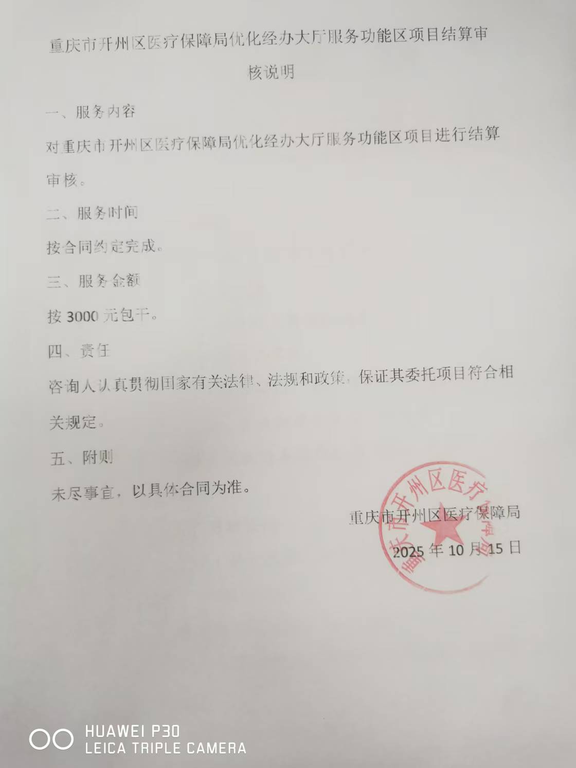 服务内容 | 对重庆市开州区医疗保障局优化经办大厅服务功能区项目进行结算审核,并出具正式报告。 |