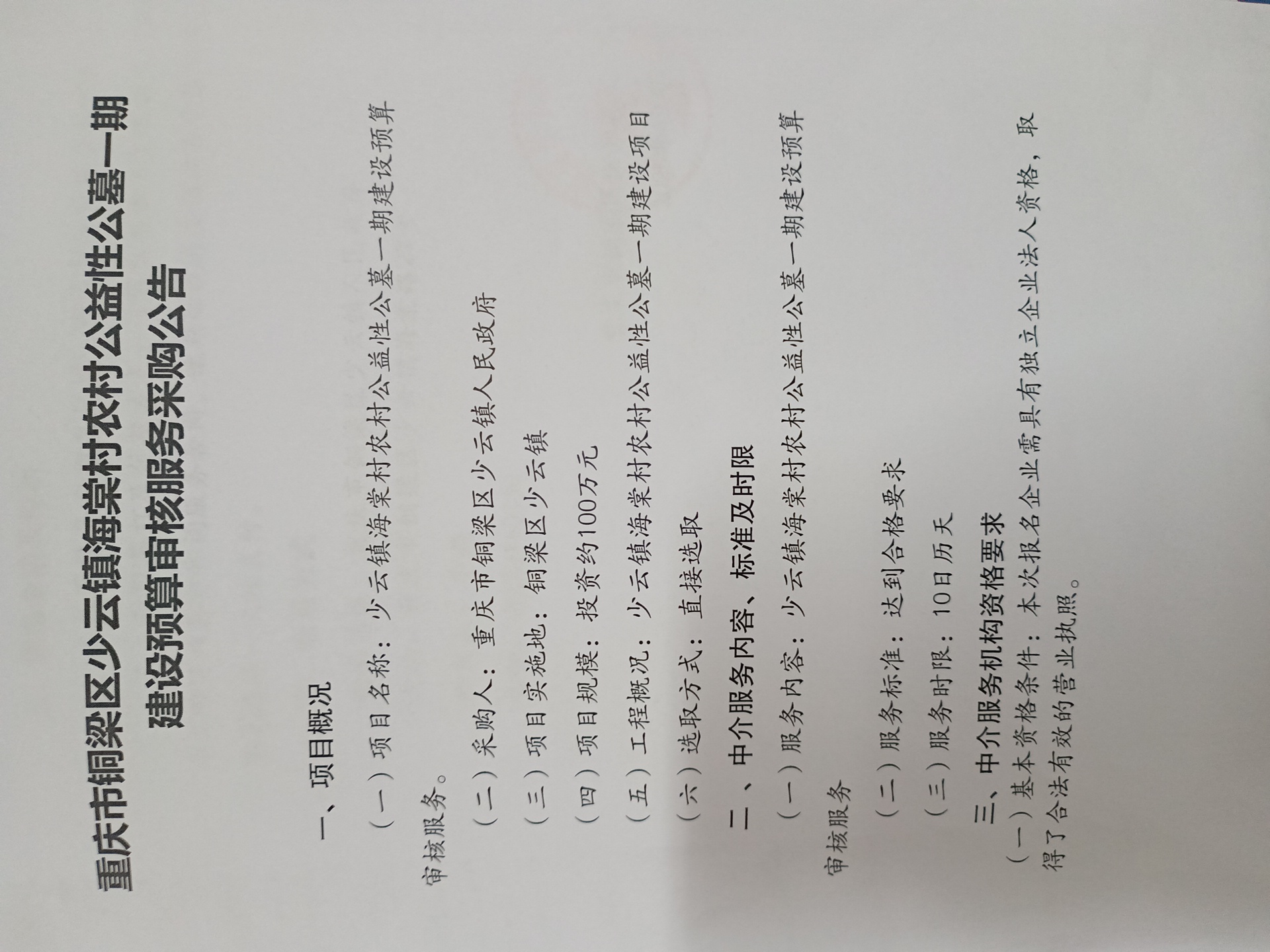 项目名称 | 重庆市铜梁区少云镇海棠村农村公益性公墓一期建设预算审核服务采购 |